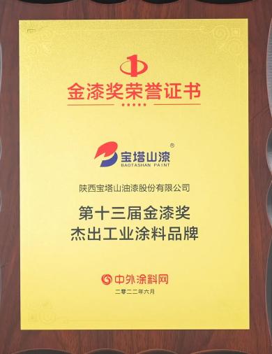2022年6月,寶塔山漆榮獲第十三屆金漆獎(jiǎng)“杰出工業(yè)涂料品牌”。
